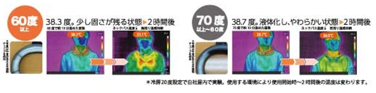 固まったままの商品を60℃以上のお湯で温める。10~15分で中身のPCMが溶けてくるので、ネックバス全体が柔らかくなればOK!約2時間ポカポカが持続!