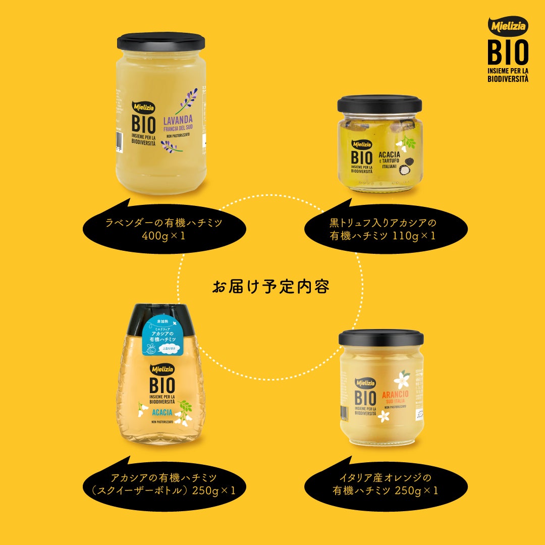 当選者の5名様には新商品のラベンダーの有機ハチミツと黒トリュフ入りアカシアの有機ハチミツ、定番人気のアカシアの有機ハチミツとオレンジの有機ハチミツの計4点をセットにしてお届けする予定です。