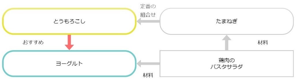 『とうもろこし』と『ヨーグルト』を例にすると、『とうもろこし』と「たまねぎ」は様々な料理で組み合わされています。一例として「たまねぎ」と『ヨーグルト』は「鶏肉のパスタサラダ」で共に利用されています。このような様々な関係性をもとに「リンク予測AI」が『とうもろこし』と『ヨーグルト』は相性が良いと判断をしています。