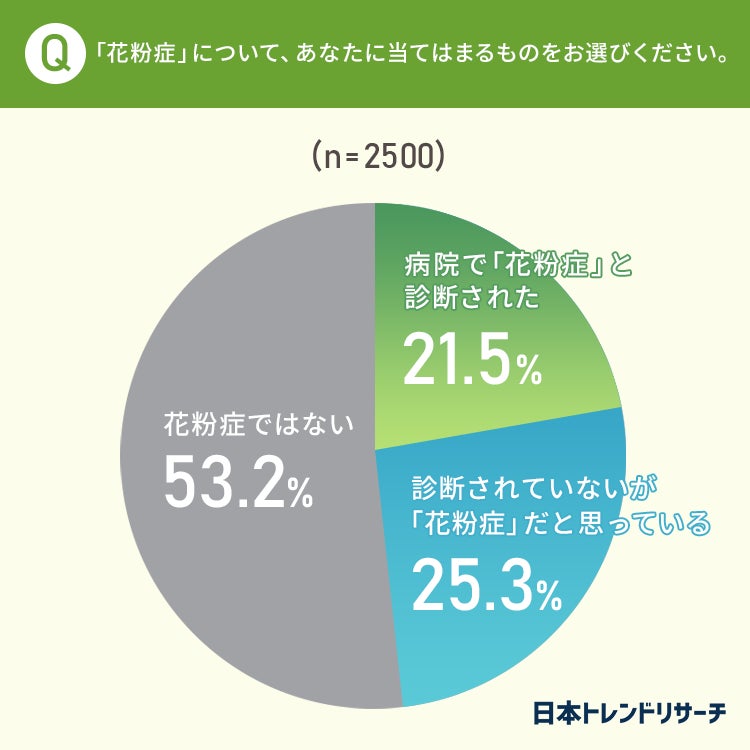 「病院で花粉症と診断された」「診断されていないが花粉症だと思っている」と回答した方が合わせて46.8%と、半数近い方が花粉症に悩まされているようです。