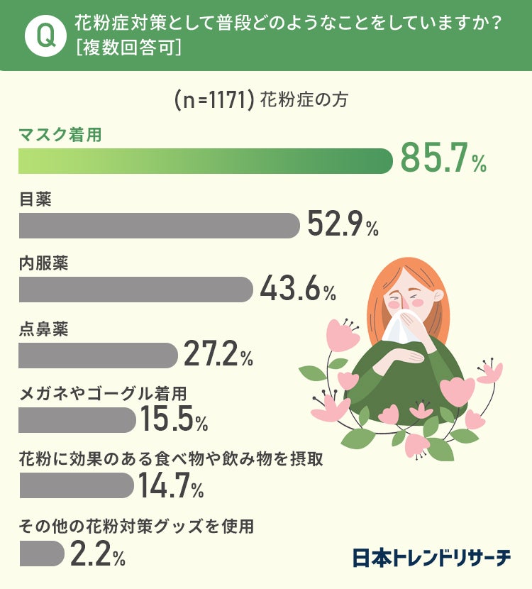 普段行っている花粉症対策としては、85.7%の方が「マスク着用」をしていると回答しました。