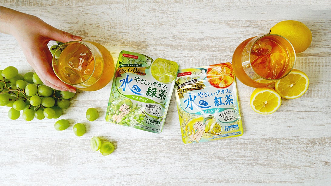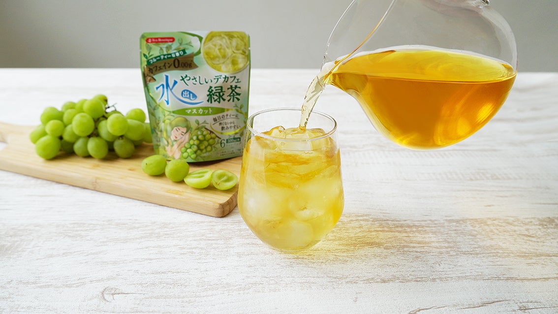 時間を気にせずいつでも楽しめる、味と香りにこだわった「やさしいデカフェ」シリーズのラインナップに、「水出しやさしいデカフェ緑茶 マスカット」、「水出しやさしいデカフェ紅茶 瀬戸内レモン」が仲間入りしました。