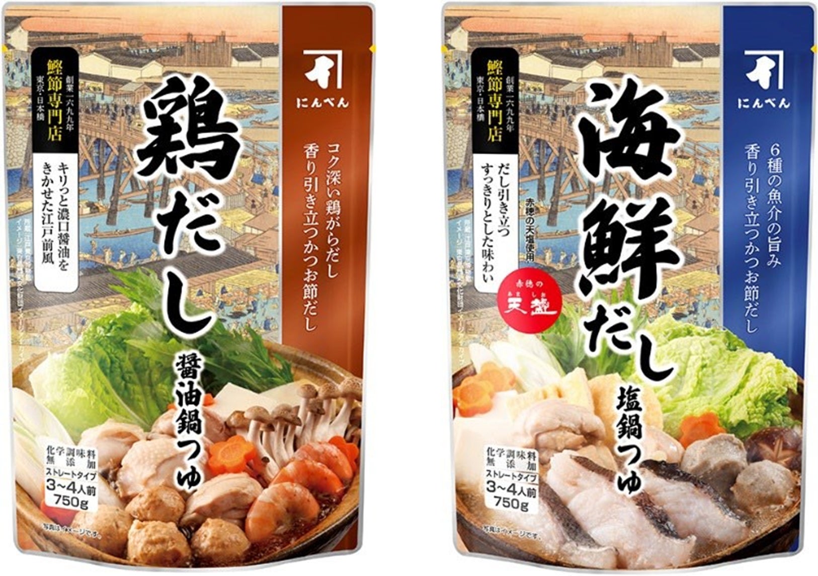 株式会社にんべんは、ストレートタイプの鍋つゆ「鶏だし醤油鍋つゆ」「海鮮だし塩鍋つゆ」を発売しています。