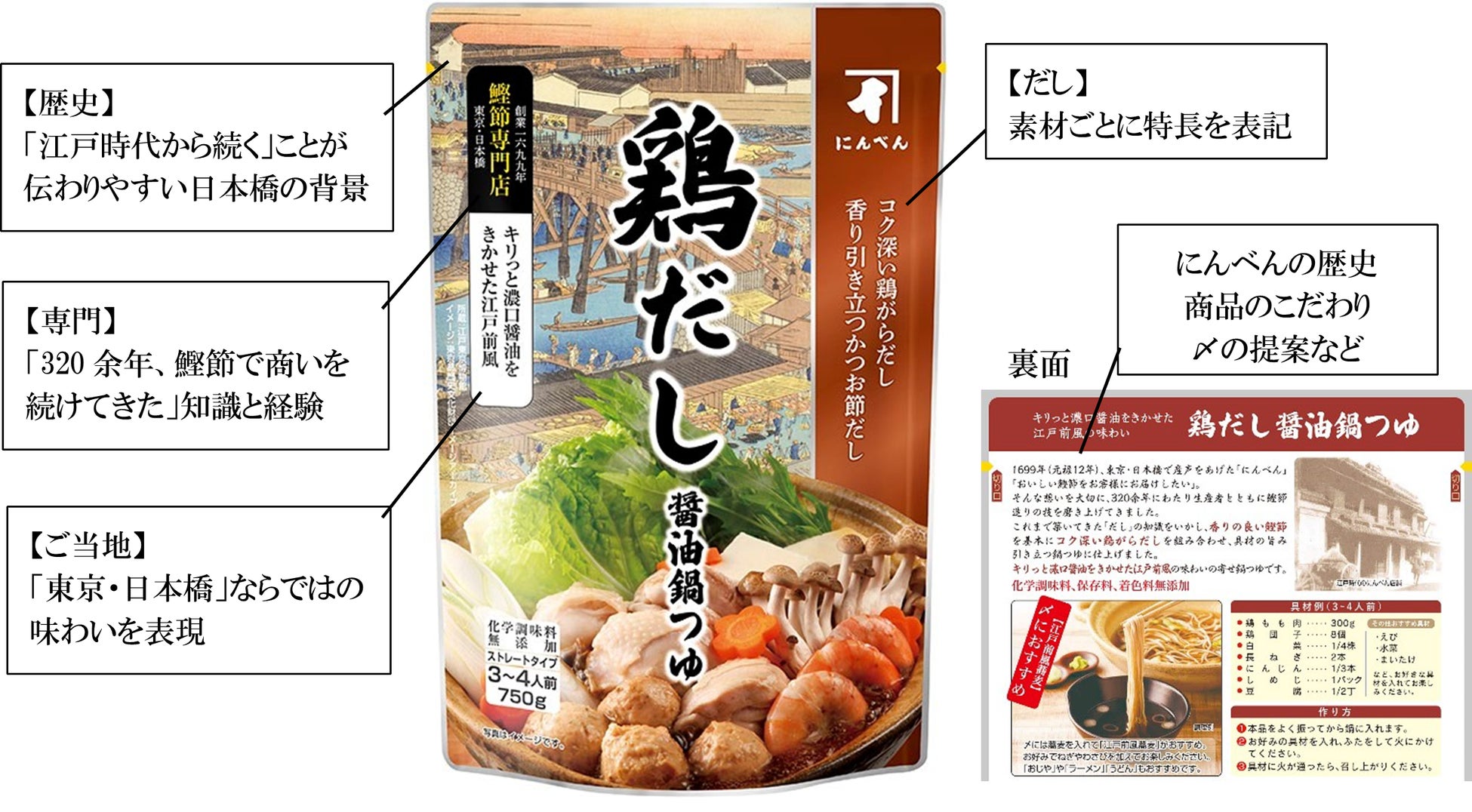にんべんの強みである「だし」と、江戸時代から続く東京・日本橋の鰹節専門店という点を表現しました。裏面では、にんべんの歴史や鰹節へのこだわり、鍋の〆におすすめのレシピをご提案しています。