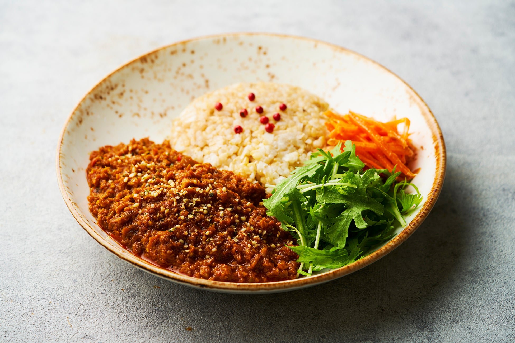 10種類ものスパイスを使用し、無農薬栽培かつ北海道産のトマトとタマネギの水分で作ったスパイシーな無水カレーです。原材料はプラントベースのみで、発芽大豆ミートを使用することで、まるでお肉のようなうま味と満足感を再現しました。