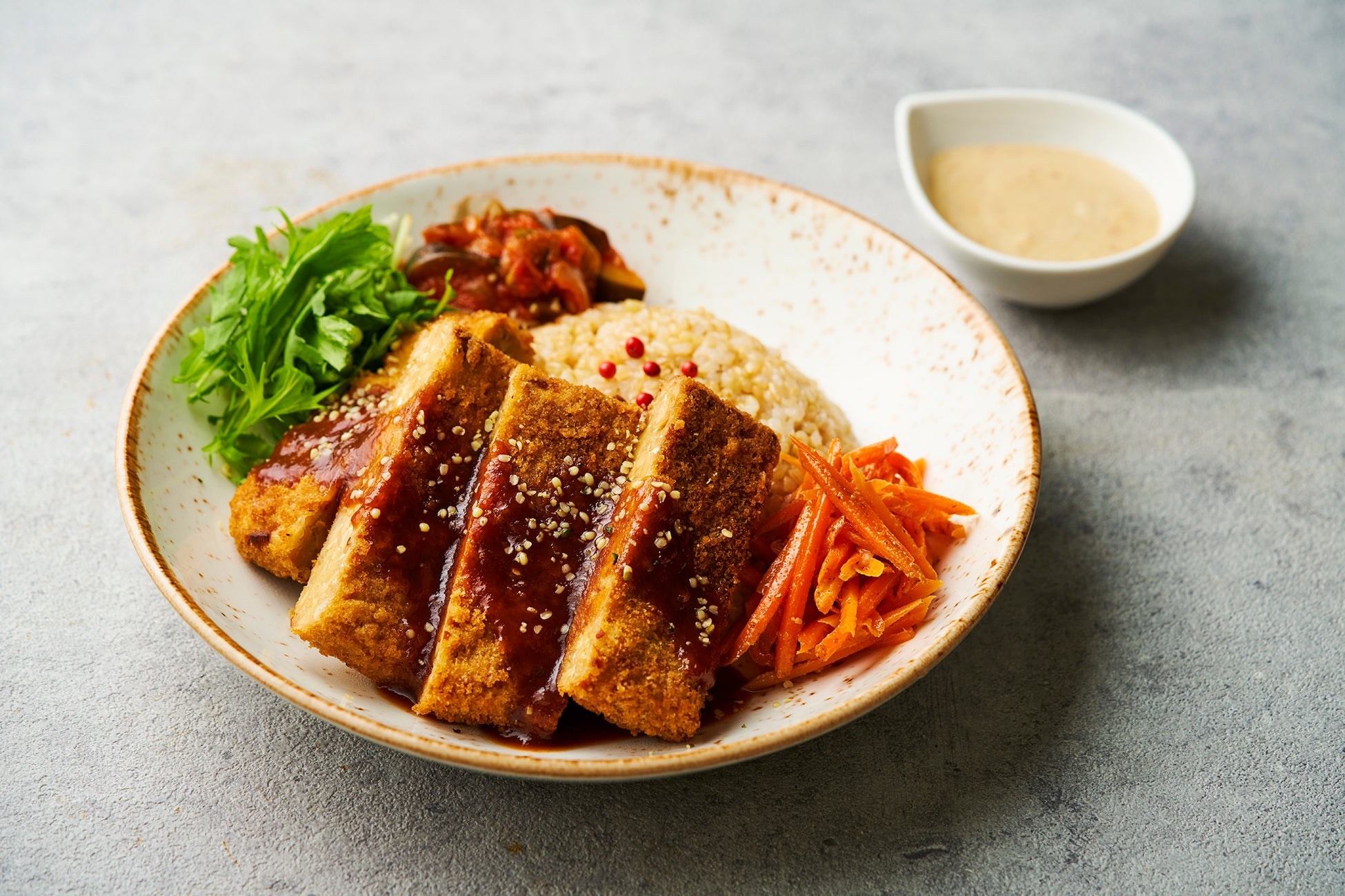 大豆発酵食品「テンペスト」にグルテンフリー仕様のパン粉(米粉ベース)を付けて、サクッと揚げたプラントべースのカツです。お好みで、自家製ソースとソイマヨネーズを付けてお召し上がりください。フードメニューの中では一番ボリュームのある一皿ですが、プラントべースであるため、ヘルシーかつ胃もたれせずにお楽しみいただけます。ライスは無農薬玄米を使用しています。