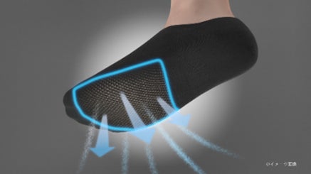 『脱げないココピタプラス さらっと実感』は高い吸水速乾機能を備えた糸と消臭糸を使い、さらに指の付け根部分と足底部分にメッシュ組織を入れ従来品の2倍の通気性を実現させた「さらっとメッシュ構造」で汗ムレを軽減するため、1日中さらっとした肌触りで快適に着用いただけます。