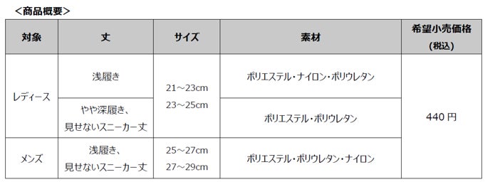 パンプスやフラットシューズに合わせやすい「浅履き」タイプや「やや深履き」タイプ、スニーカー専用の「見せないスニーカー丈」タイプ。