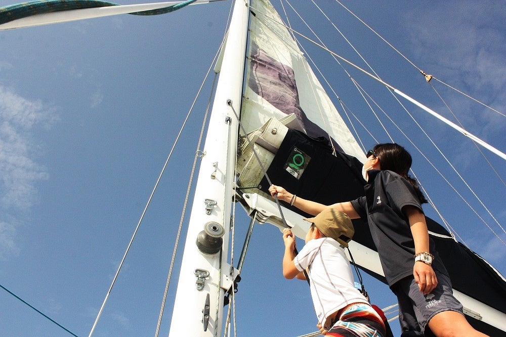 お子様だけで体験する「キッズヴォヤージュ」。44フィートの大型カタマランヨット「マハイナ号」に乗って、ヨットが動く仕組みや海上での船の進み方などをスタッフから学び、セイルアップや操船を体験します。