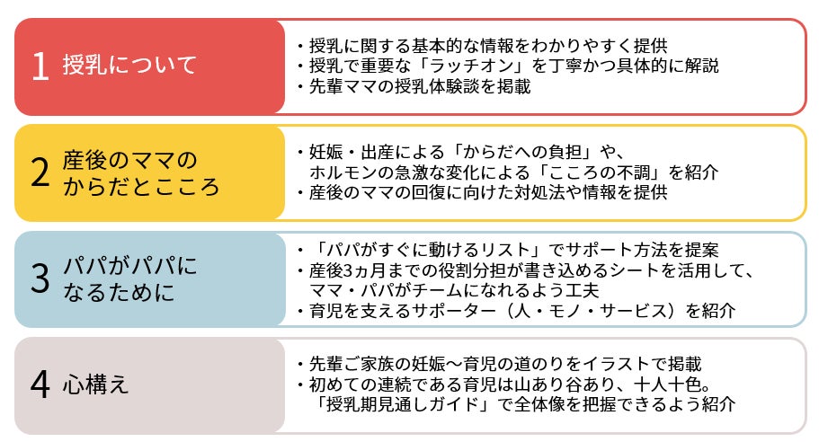 この度のリニューアルでは、コロナ禍の影響からママの産後うつが増加傾向にあることを踏まえ、「産後のママのこころの健康」について内容を充実させました。産後のからだの回復に向けた睡眠や食事方法への具体的なアドバイスを掲載したほか、産後すぐの心身ともに大変な時期を支えてくれる助産師などのサポーターや、産後ケアセンターなどの施設を紹介するなど、全方位的な情報提供に努めました。