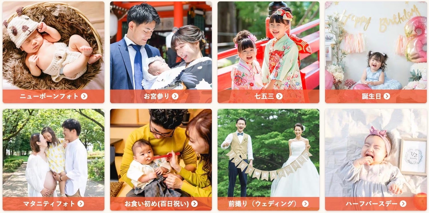 シンプルな料金設計と、好きな場所に好きなフォトグラファーを指名して撮影予約ができるのが特徴。マタニティ、ニューボーン(新生児)、お宮参り、誕生日、七五三、卒入園・卒入学、成人式、結婚式の前撮り・後撮り、長寿祝いなど、ご家族の記念日に寄り添う「我が家の専属カメラマン」として、全国のご家族にご利用いただいています。