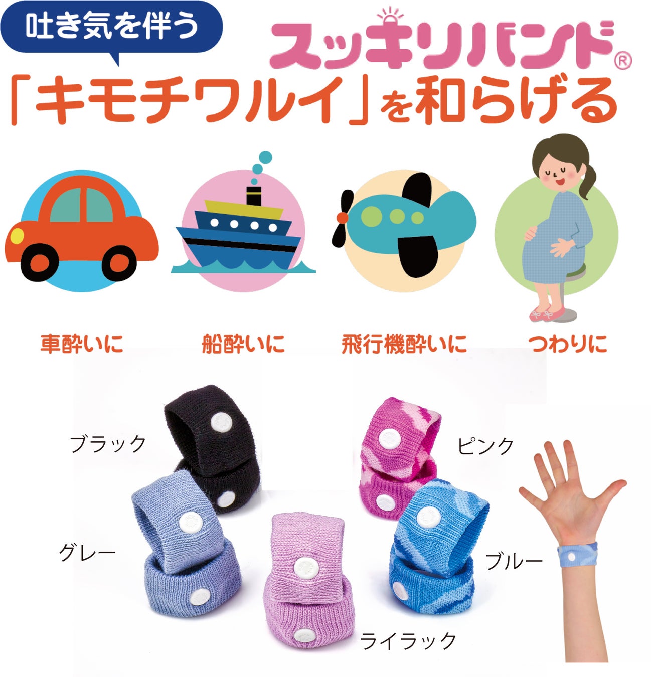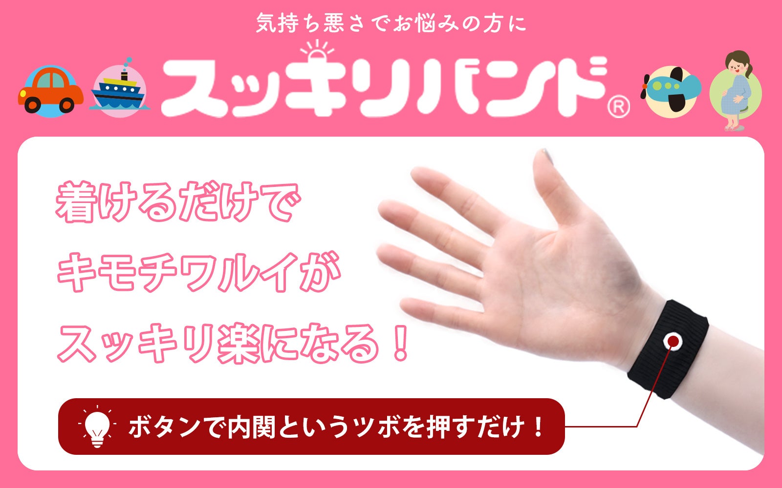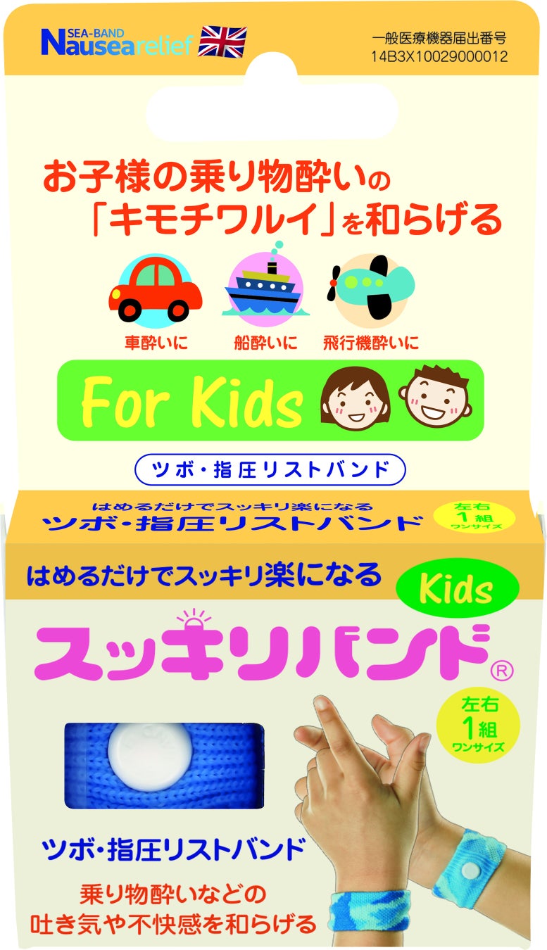 「スッキリバンド®」は、乗物酔いや緊張、二日酔い、様々なキモチワルイ不快感を軽減するツボとして効果的な“内関(ないかん)”を押すリストバンド状の一般医療機器で、繰り返し使用でき眠気などの副作用もなく、子どもから高齢者まで幅広い層にご利用いただいています。