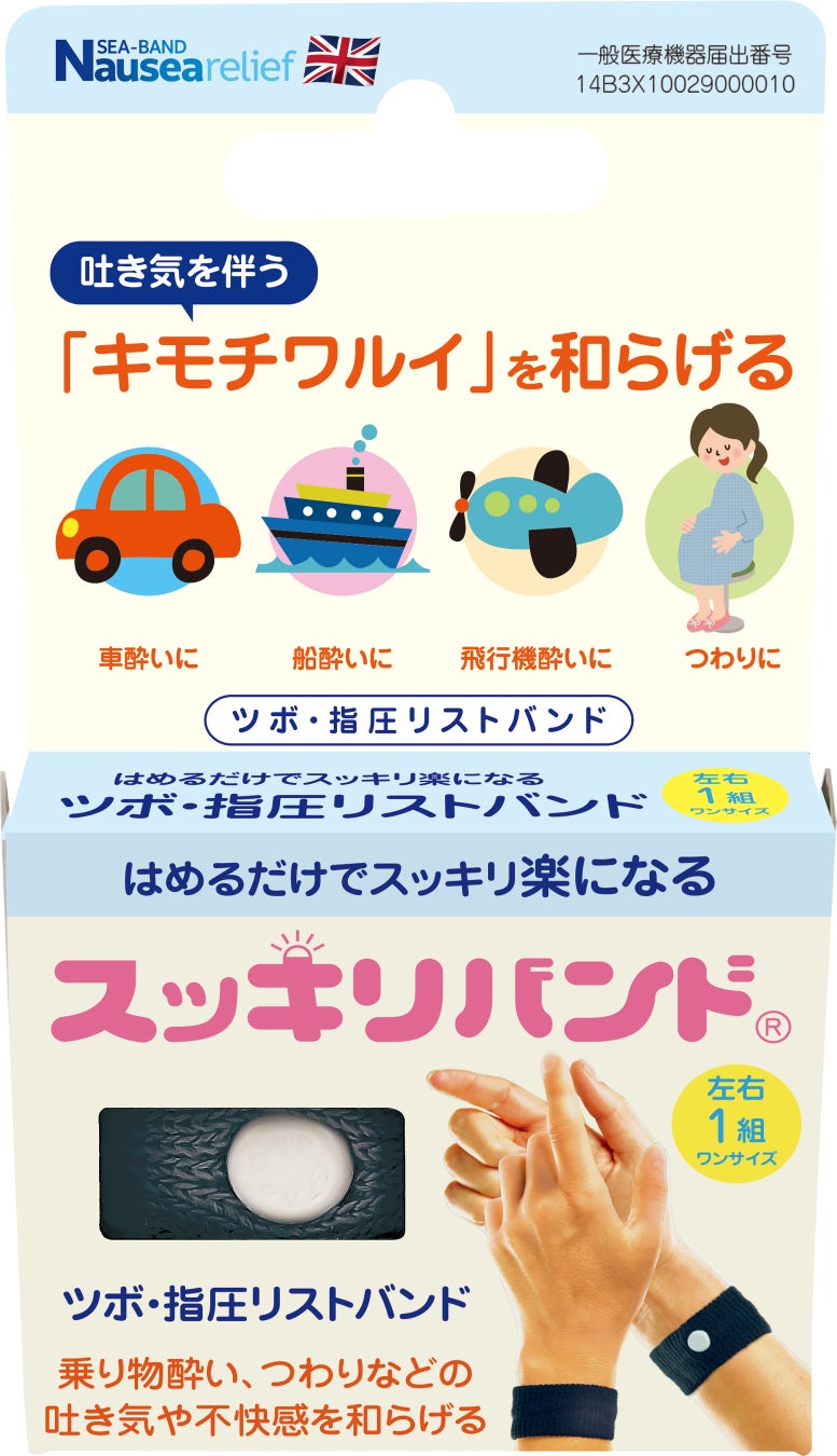 『スッキリバンド®』(2021年4月10日新発売)は、英国シーバンド社が製造し、世界50か国以上で販売する吐き気緩和リストバンドで、海外では「シーバンド®」という名前で親しまれています。