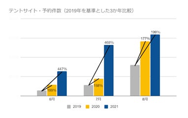 2021年7月のテントサイトの予約件数は、コロナ前の2019年の7月に比べて、4.68倍に増え、止まらない人気がうかがえます。2021年の春~GWはキャンプ場の休業や一部区間の閉鎖を余儀なくされたため、2022年はさらなる予約件数の伸びが期待されます。