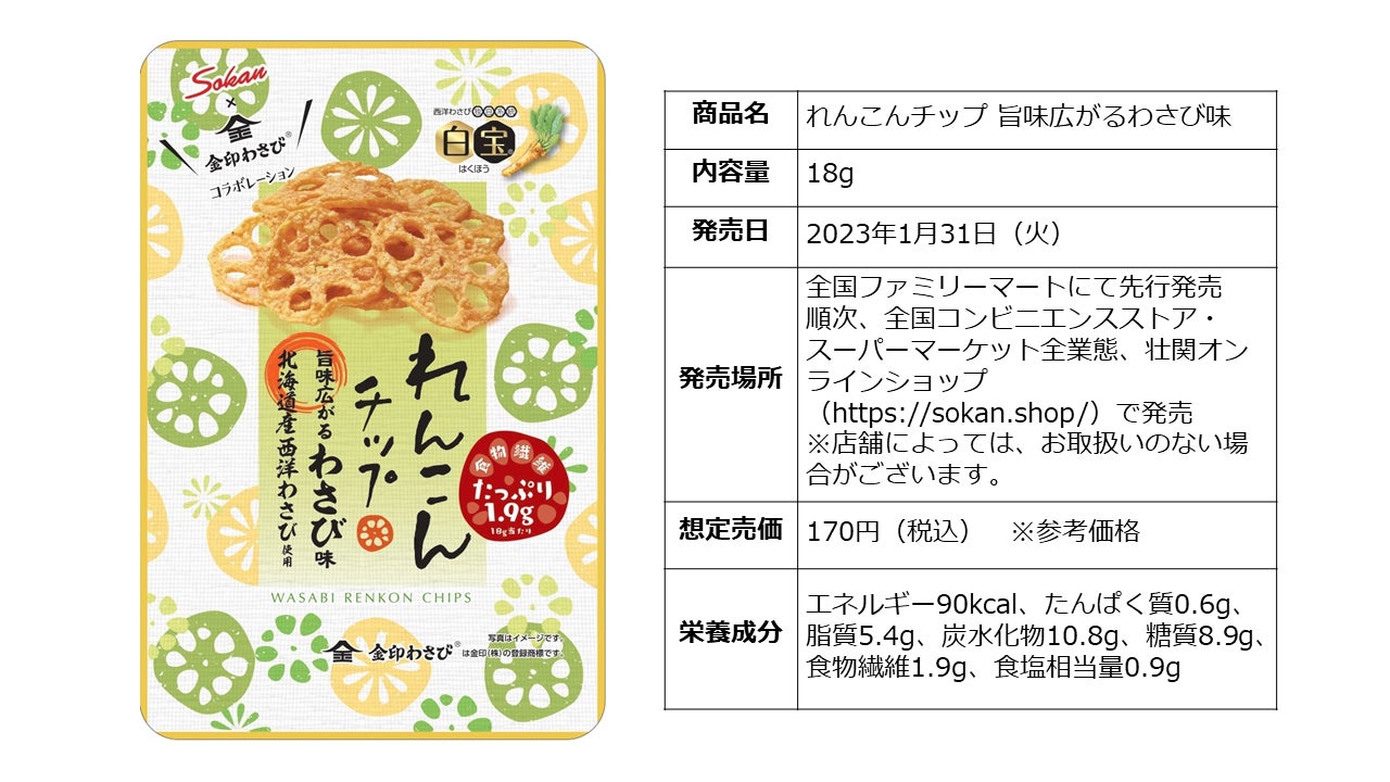 株式会社壮関は、新商品『れんこんチップ旨味広がるわさび味』を、2023年1月31日(火)より全国のファミリーマートにて先行販売しています。