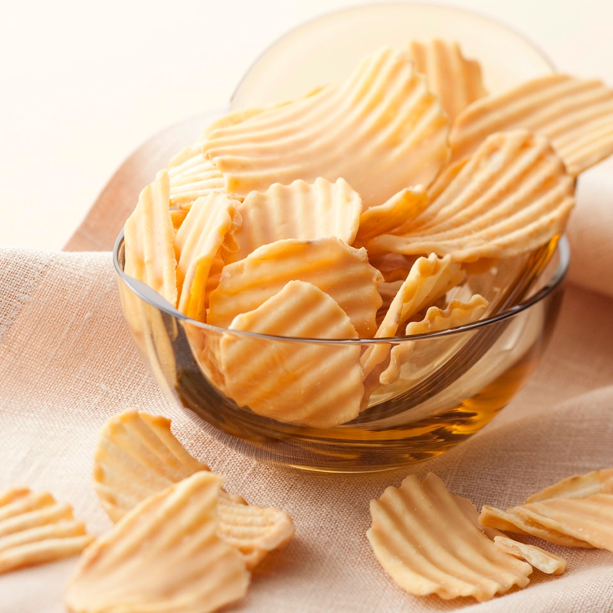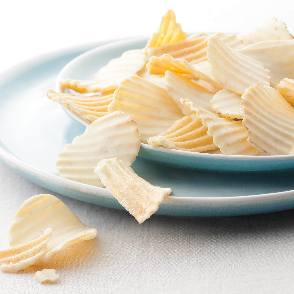 ポテトチップの片面に、チーズの風味がほんのり香るホワイトチョコレートをかけました。