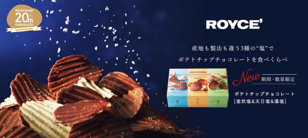 パリッとしたポテトチップの片面に、チョコレートをコーティング。一度食べたらクセになる甘さと塩味のハーモニーは、愛され続けて20年。このたび誕生20周年を記念して、日本各地の製法の異なる3種の“塩”で食べくらべるポテトチップチョコレートが期間・数量限定で新登場。