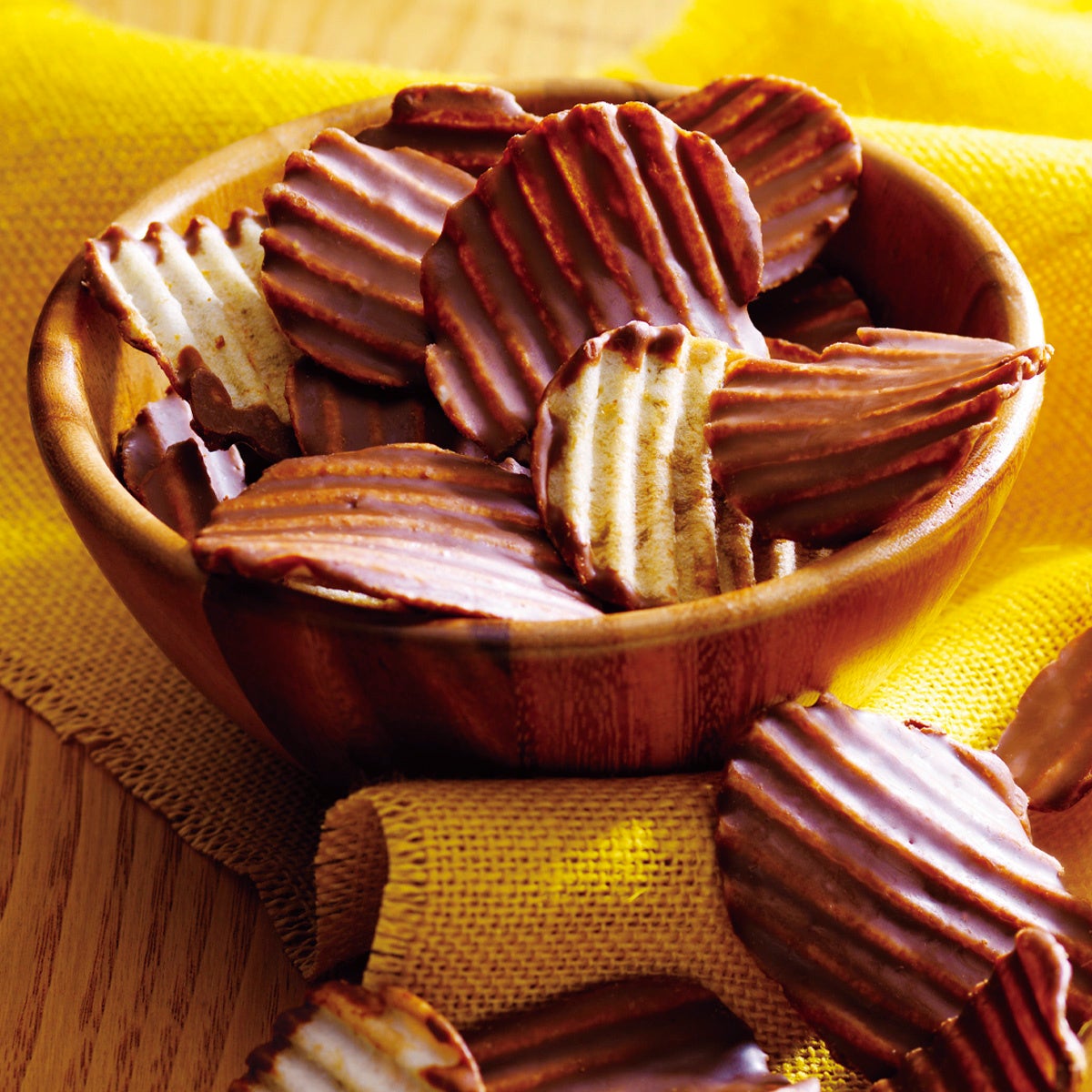 ポテトチップの片面に、キャラメル風味のホワイトチョコレートをかけました。