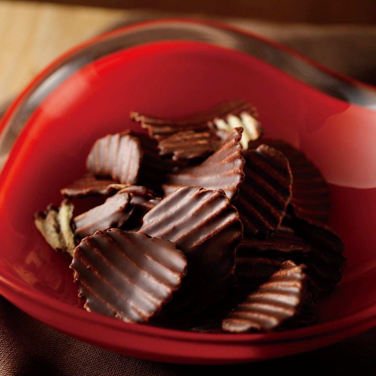 ポテトチップの片面に、カカオの香り豊かな甘さ控えめのチョコレートをコーティングしました。