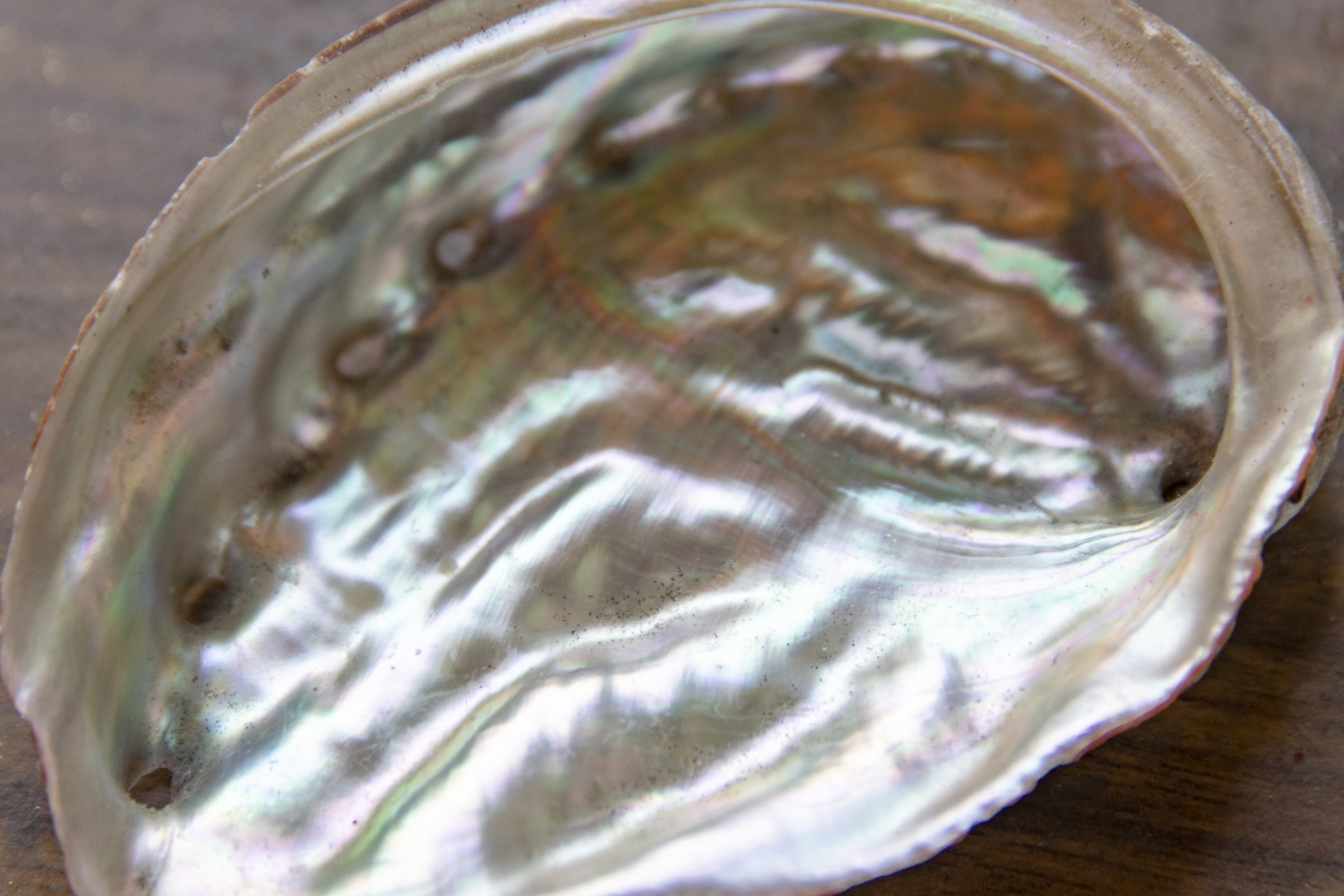 螺鈿の材料となるあわび貝。「貝の内側には、浄化のパワーがあるといわれているんですよ」。今は「薄貝」を製作する専門業者も減り、螺鈿は希少かつ貴重なものになっています。