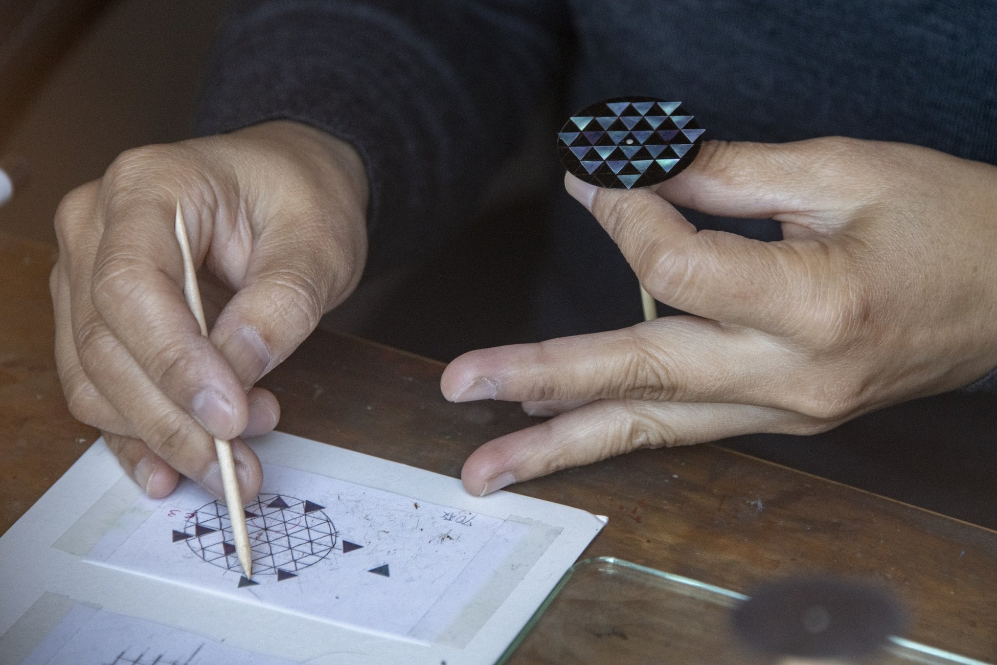 漆器の表面をあわび貝の貝殻などで飾る伝統的な技、螺鈿。