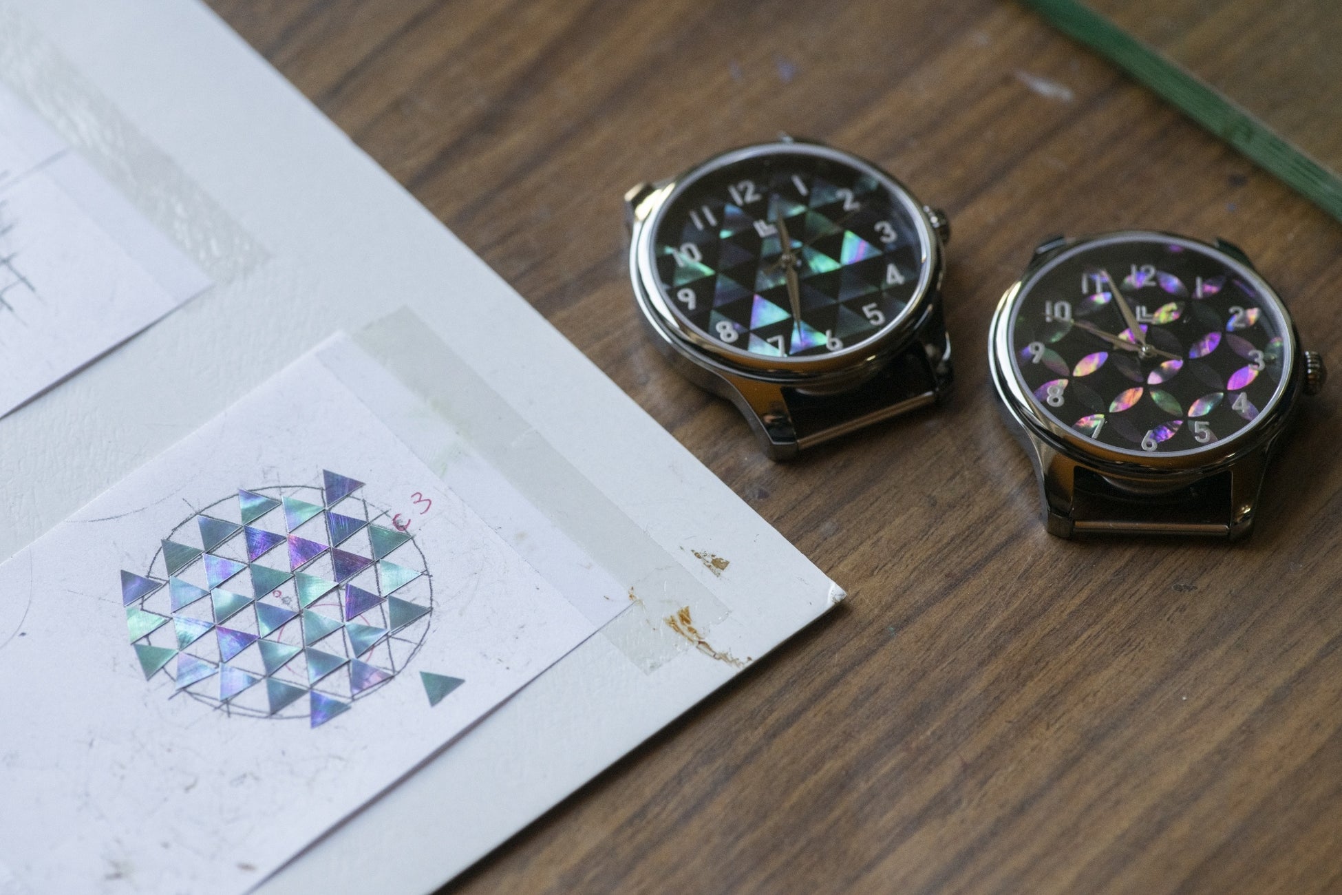 素材は乳白色の「厚貝」と、赤、青、緑など宝石のような輝きを放つ「薄貝」があり、今回は厚みわずか0.1ミリ以下の「薄貝」を用い、腕にかけて時計を見たときに一番輝きを放つよう、蒔絵師が一枚一枚選別して貼りつけ、仕上げました。