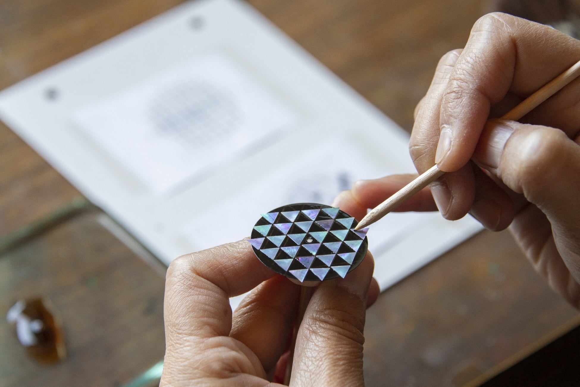 「螺鈿は、材料の選別と向きが大事。方向が違うと光り方が鈍くなります」と蒔絵師の山口明子さん。文字盤に置くパーツの色味を藍と紅で選り分け、実際に並べて光り方を確認します。