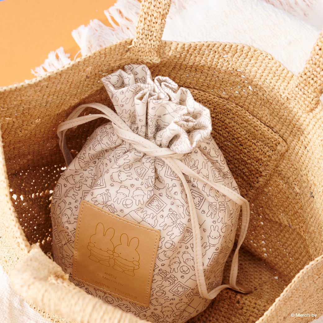 ミッフィーとメラニーの総柄を使⽤した⼱着バッグがセットのラフィア素材カゴバッグ。
