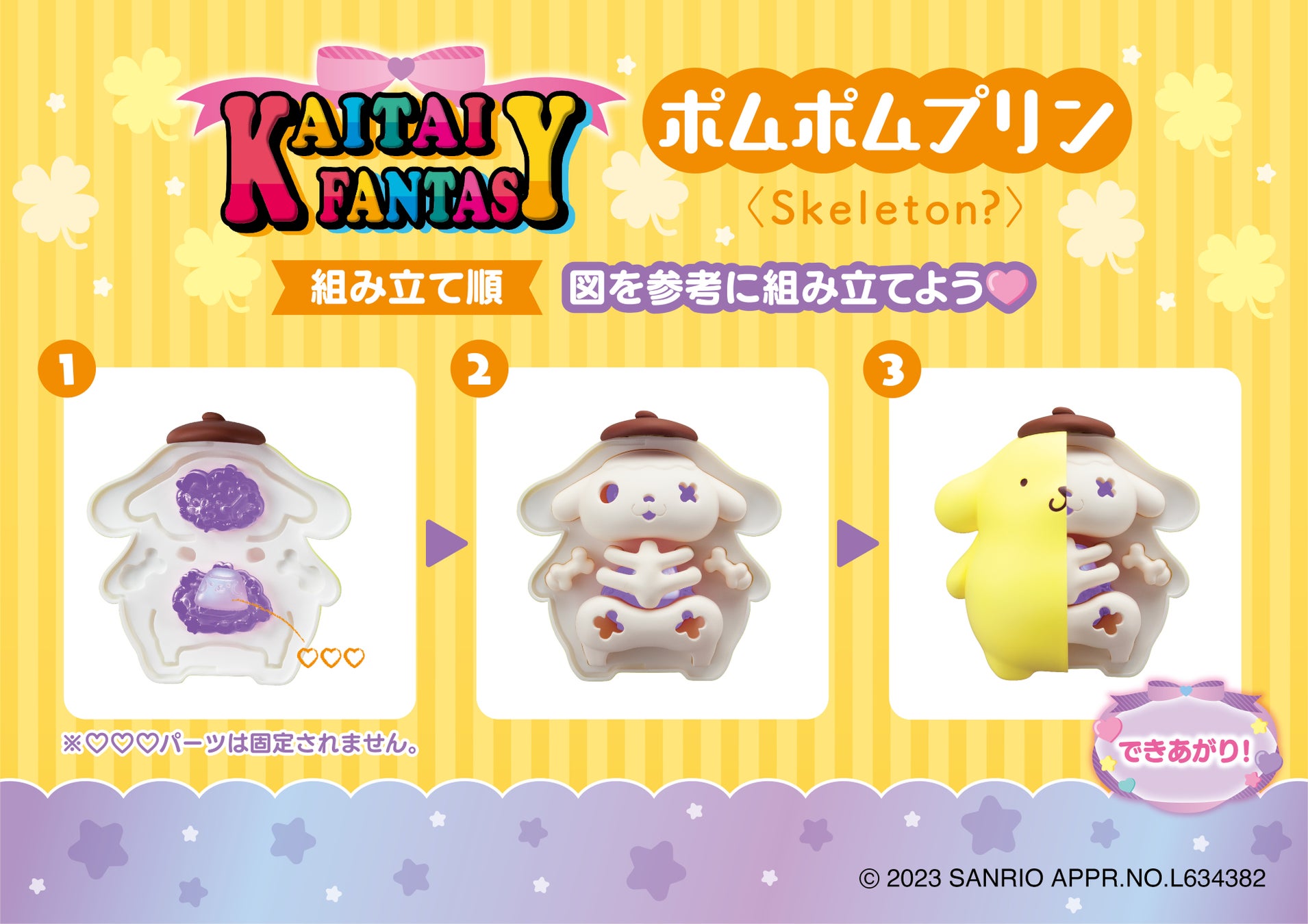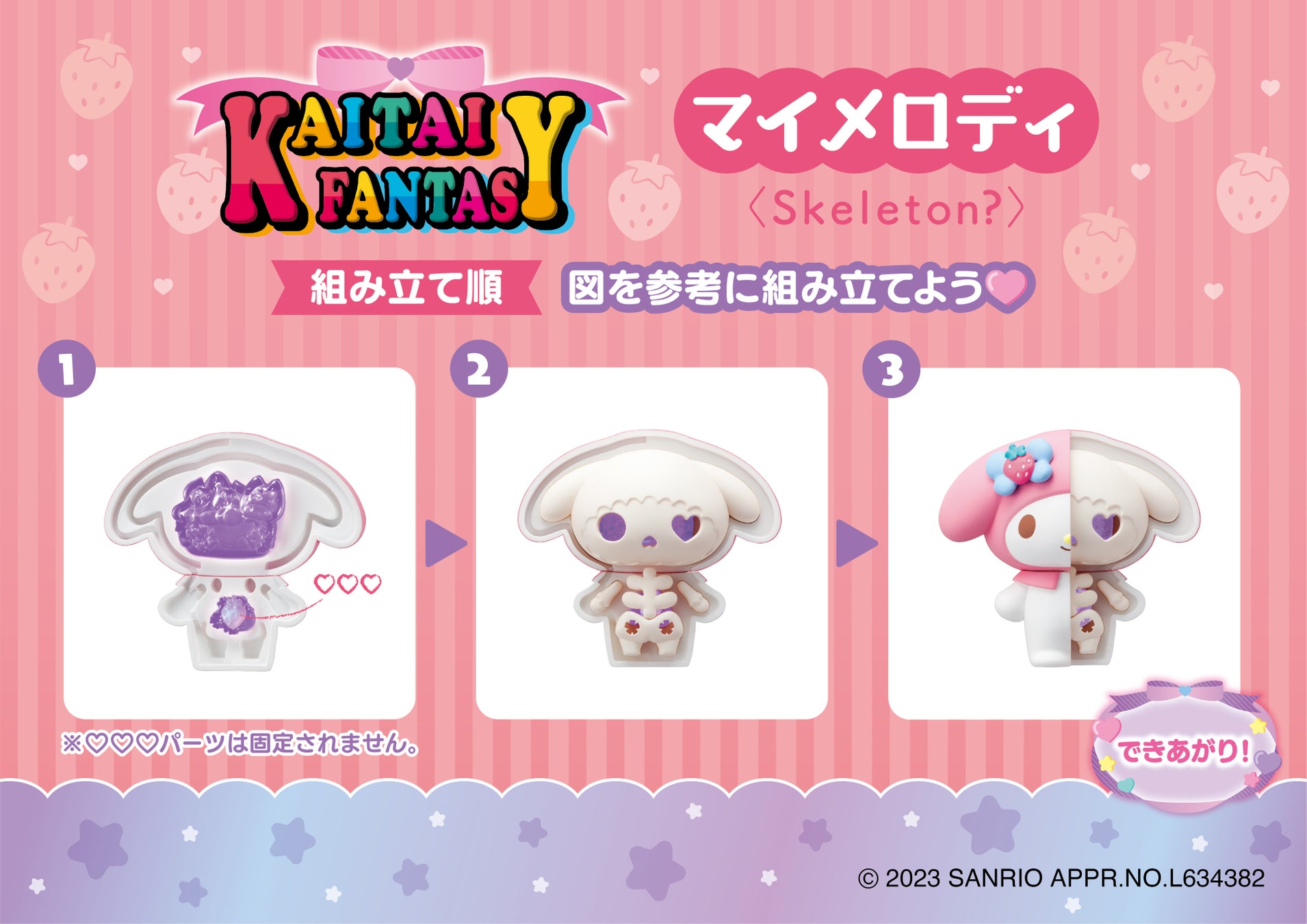 「KAITAI FANTASY サンリオキャラクターズ ファンシーパープル」は、「クロミ」、「マイメロディ」、「シナモロール」、「ポムポムプリン」の全4種のラインアップです。大事な♡♡♡は、オーロラ塗装のキラキラとしたカワイイパーツになっています。この大事な♡♡♡をはじめ、各キャラクター約10パーツでの構成となり、側面のボディパーツから外していくと次第にキャラクターの内側があらわになる新感覚のコレクションフィギュア商品です。