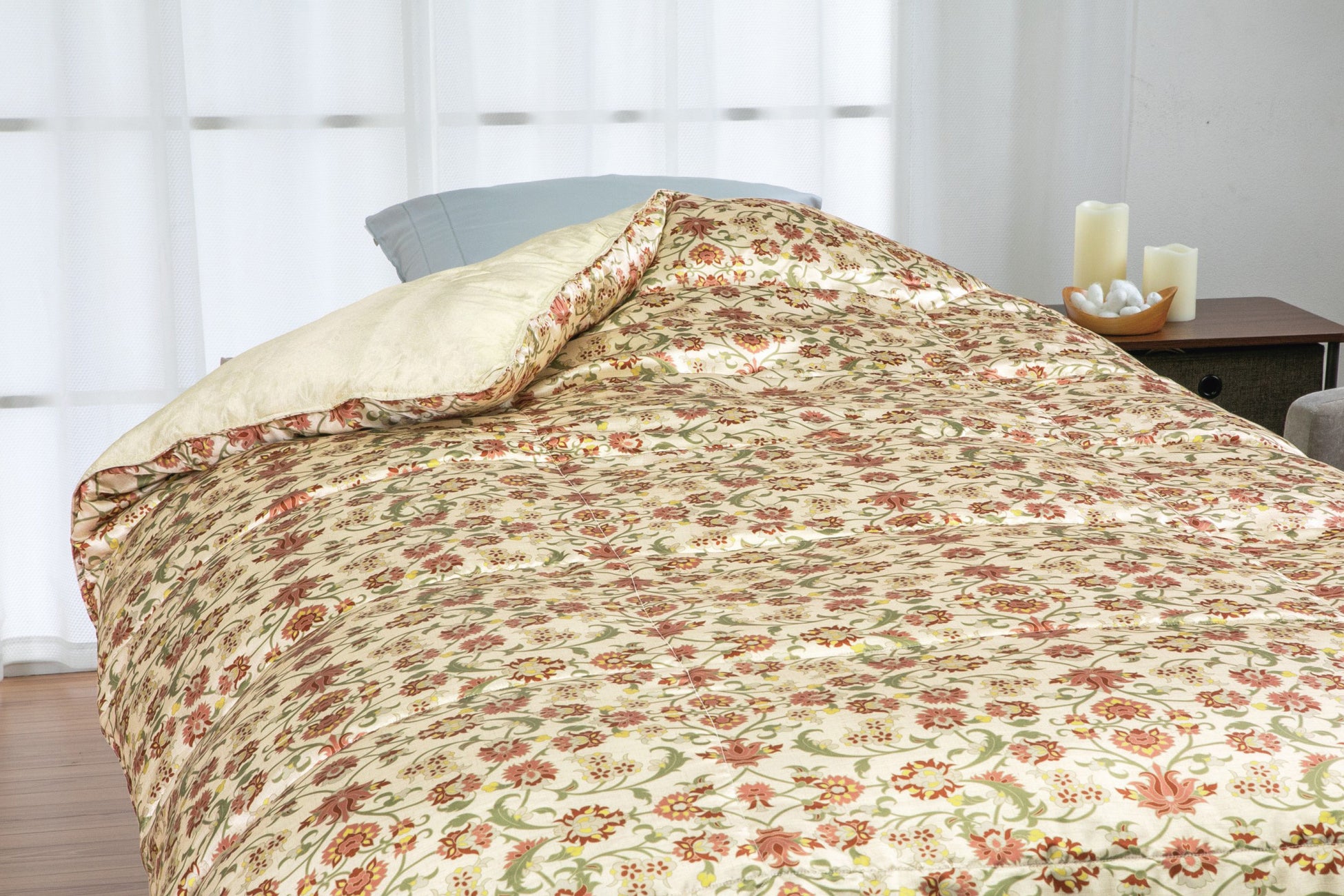 外層部に真綿を使用いているため、ふとんが身体により密着し、隙間が少なくなるため、包まれ感をより感じることができます。また、通常の羽毛ふとんより重量感があるが、その点がかえって心地よい重さとなって、睡眠によい影響を与えていると考えられています。