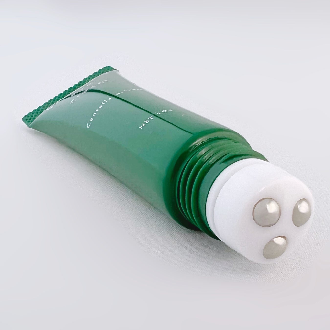 チューブを押してアイクリームを適量出したら3つのボールがついた先端を目元にあて、やさしく転がしてマッサージするように塗布します。最後に指で馴染ませたら、目元にじんわりと温感(※5)が広がります。