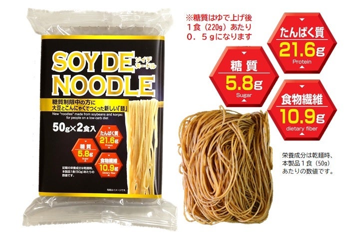 こんにゃくは食物繊維が豊富でカロリーが低い食品です。大豆麺にこんにゃくを混ぜることにより食物繊維の量を増やすことができました。しかも注目は糖質!1食50gあたり乾麺では5.8g配合されていますが、ゆでると0.5g!!(個体差により変化します)。栄養価があり高たんぱくで食物繊維が豊富に含まれているのに低糖質麺!!!こんな麺は「SOY DE NOODLE(ソイデヌードル)」しかありません。