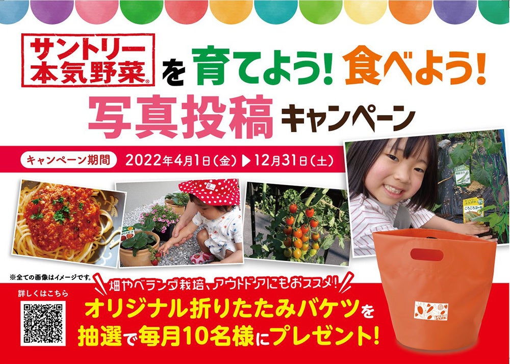 サントリーフラワーズ(株)は、より多くのお客様に、野菜を育てる楽しさや家庭菜園を身近に感じていただきたいという思いから、2022年「本気で野菜」プロモーションとして、「『サントリー本気野菜』を育てよう!食べよう!写真投稿キャンペーン」「『サントリー本気野菜』キッズサンプリング」を4月1日(金)より順次開始します。また第1期「『サントリー本気野菜』 公式アンバサダー」による情報発信を4月下旬から開始します。