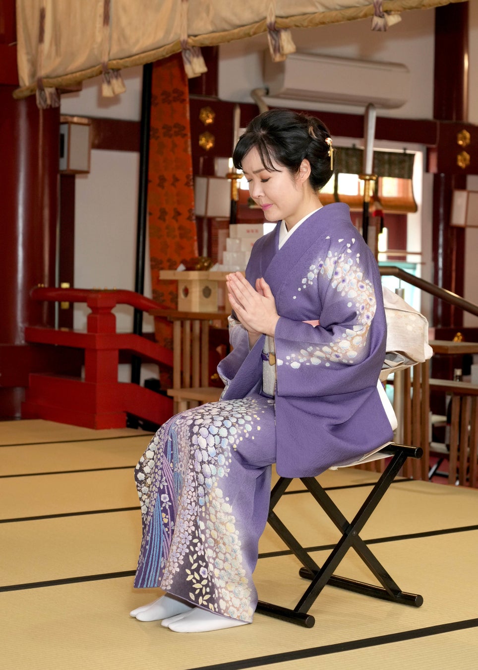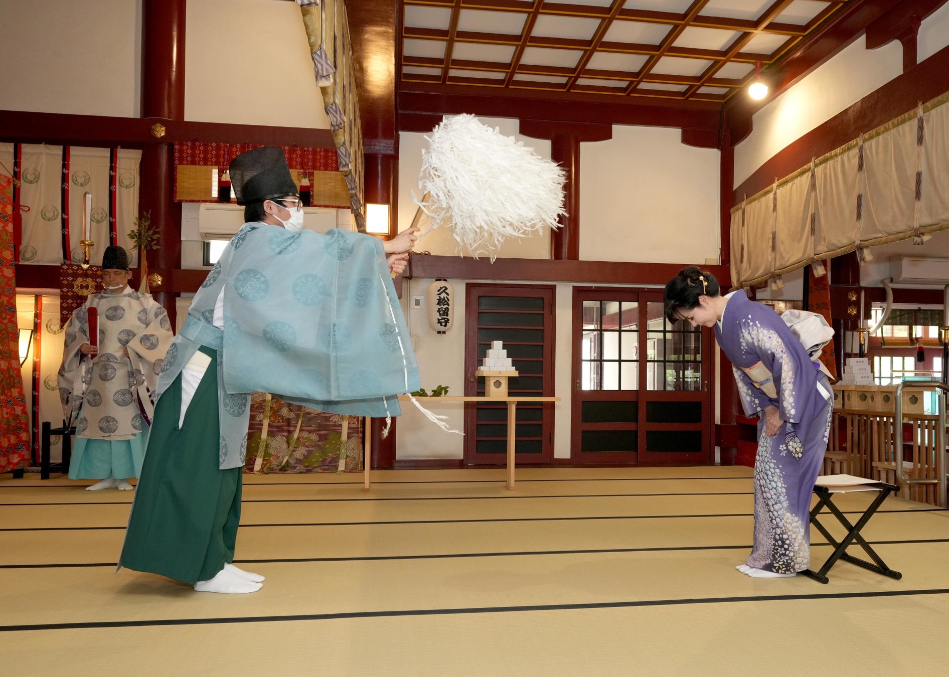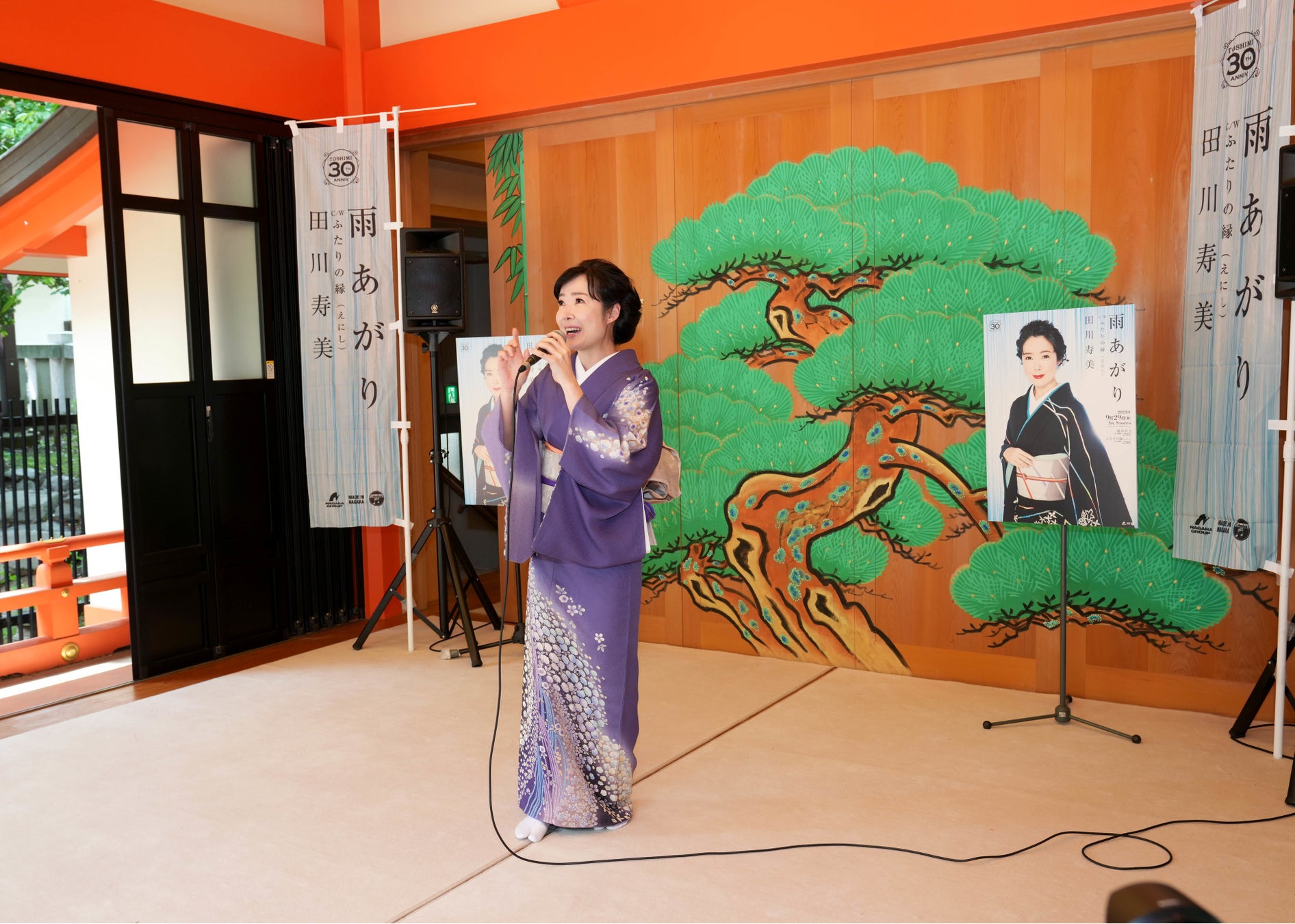 ご祈祷の最中、神妙な面持ちでヒットへの感謝を込めて神前に深々と頭を下げた田川は、その後、境内の神楽殿に移動し、大勢のマスコミ関係者や参拝客が見守る中、「雨あがり」を歌唱奉納。「神楽殿で歌わせていただいたのは、これが二度目でして、17枚目のシングル『女人高野』をリリースした2002年に、その歌の舞台となった奈良・室生寺の神楽殿でシークレット・ライブをやらせていただいて以来です。ここは、とてもすてきなところですね」と笑顔を見せた。