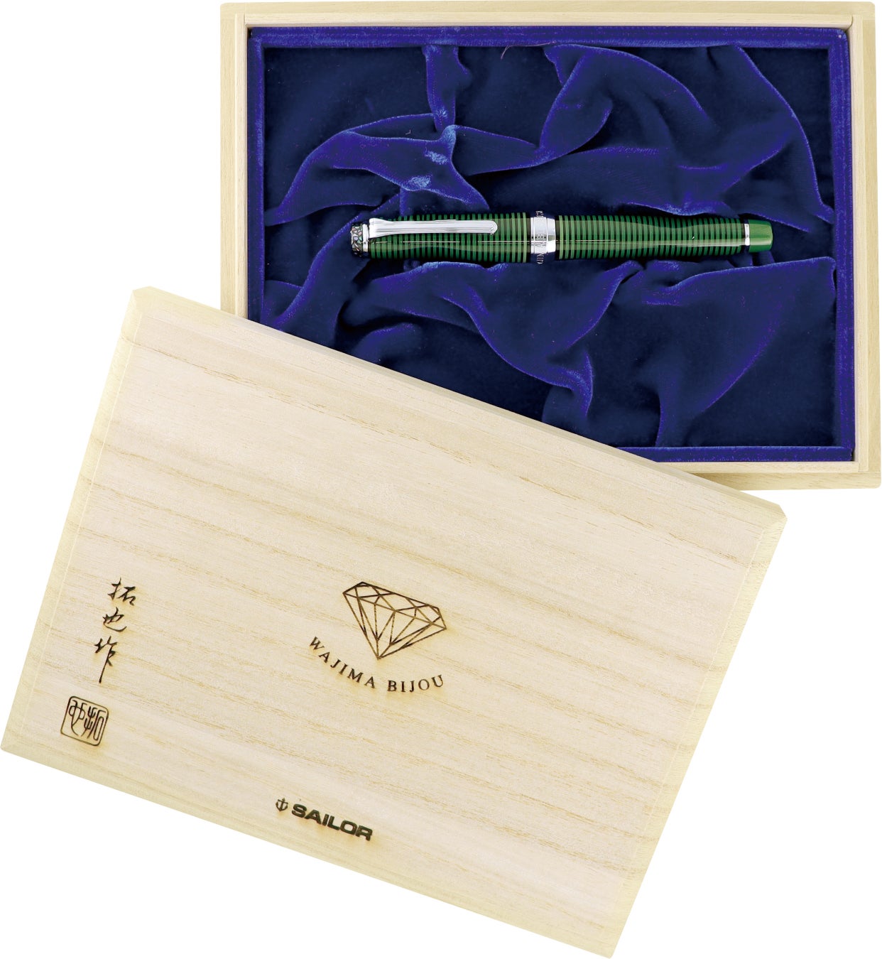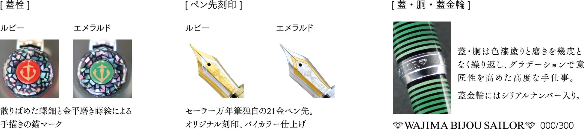 輪島塗蒔絵職人 日野拓也氏の手作業により1 本1 本丁寧に塗りと蒔絵を施した、この万年筆そのもの自体が「Bijou」と呼ぶのに相応しい1 本です。オリジナルデザインを施した蓋金輪にはシリアルナンバーを入れ、セーラー万年筆独自の大型21 金ペン先を搭載いたしました。カラーはルビー(レッド)とエメラルド(グリーン)の2種。国内・海外、各色300 本限定で販売いたします。