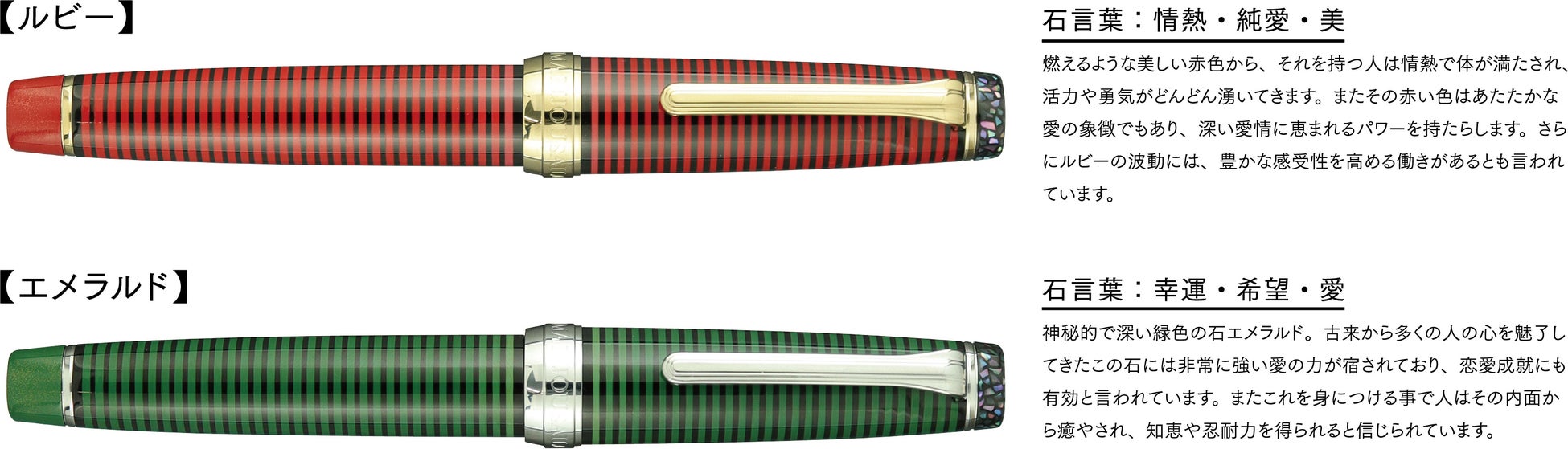 宝石=Bijou(ビジュー)をイメージさせるデザインと光沢感、宝石の石言葉を組み合わせて魅力ある世界観を表現しました。本体のボーダー・蓋栓・尾栓は色漆や螺鈿、純金粉蒔きなどを用いて仕上げられています。宝石にはそれぞれに「石言葉」があり、この万年筆にはその「石言葉」のパワーが宿っています。