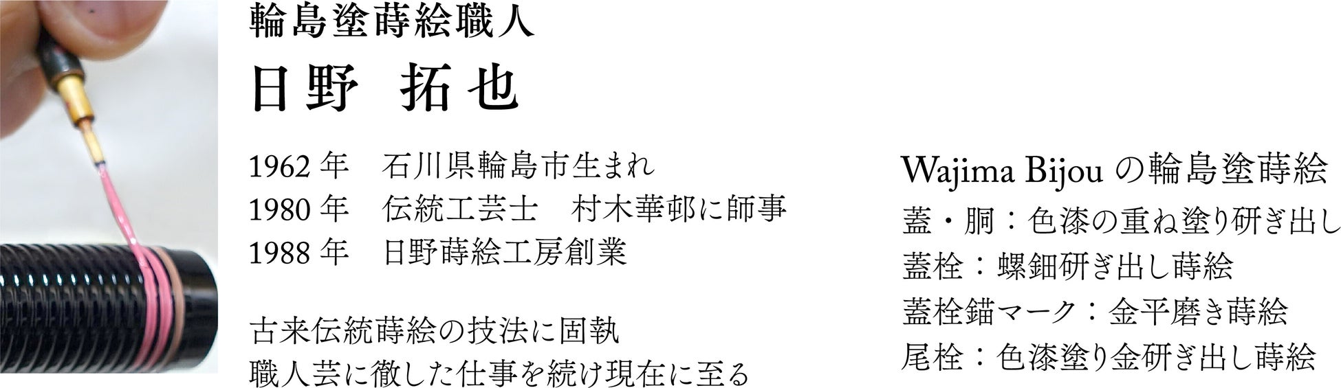 「WAJIMA BIJOU 万年筆」は輪島塗と蒔絵技法を駆使して本体の凹部(溝)を埋め込み、塗りと磨きを何度も繰り返して表面を平滑で光沢のある仕上がりとした伝統工芸の息づく漆塗り万年筆です。