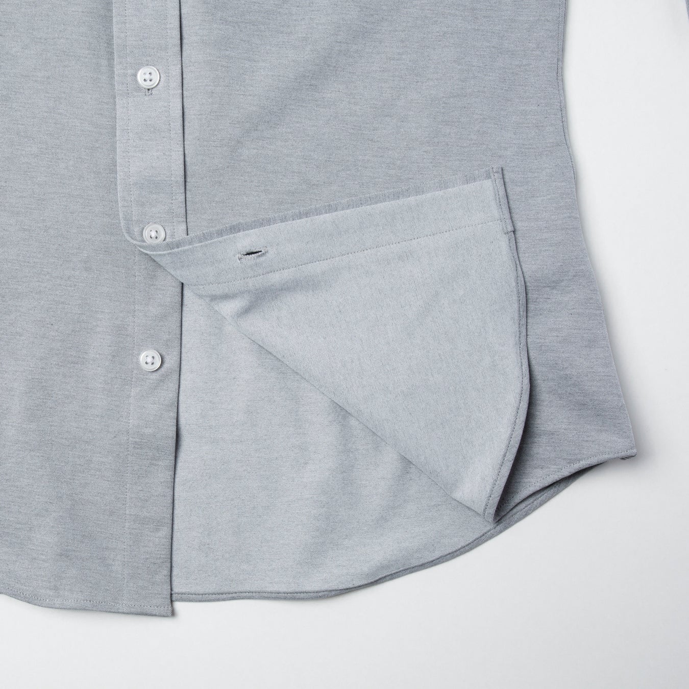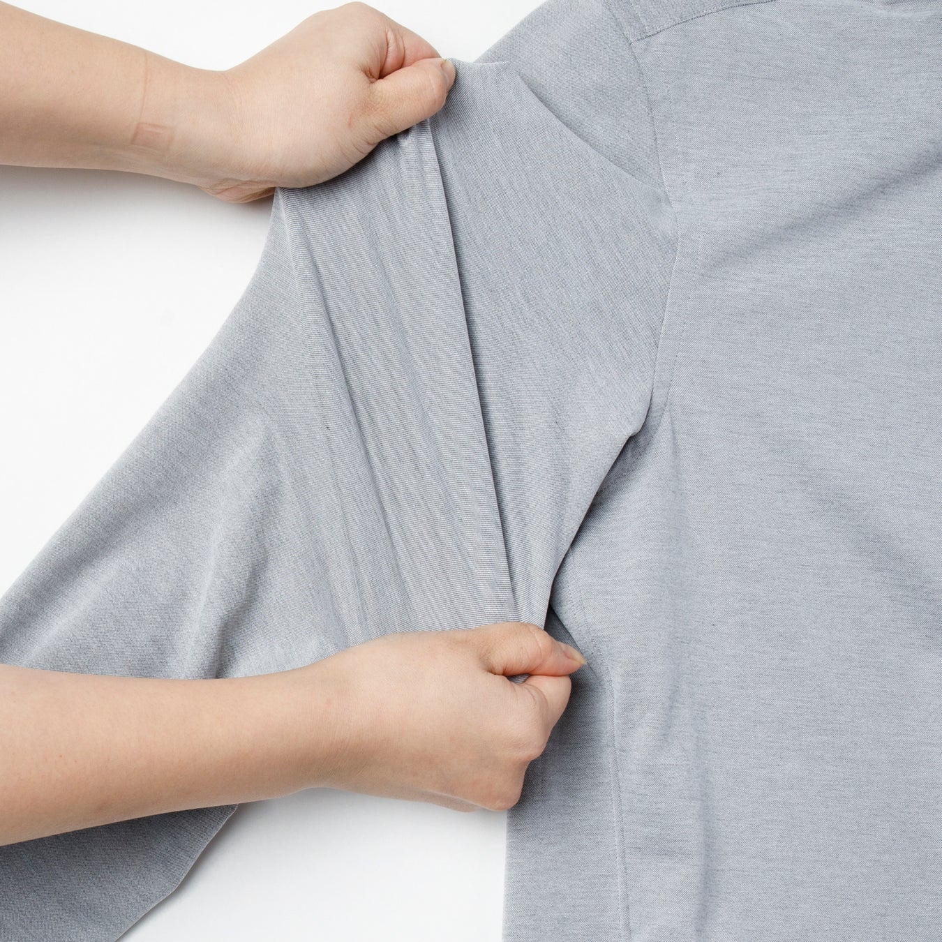 同素材はポリエステルと綿で構成し、表面裏面で繊維の配合を変えることで、表面は柔らかい肌触りに、裏面は肌着のようななめらかさを追求しました。さらに、ストレッチ性のある糸を使用し、よりストレッチが効く編み方にしているため、着用時に突っ張りのない360度ストレッチを実現しました。吸水速乾に優れ、汗をかきやすい季節でもすぐに乾き、汗によるべたつきを解消します。またしわになりにくい素材を使うだけでなく製品の段階でもしわになりにくい加工を加えているため、アイロン不要となります。