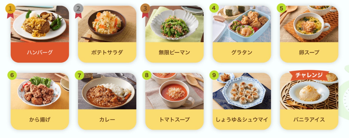 ハンバーグ/ポテトサラダ/無限ピーマン/グラタン/卵スープ/から揚げ/カレー/トマトスープ/しょうゆ&シュウマイ/バニラアイス