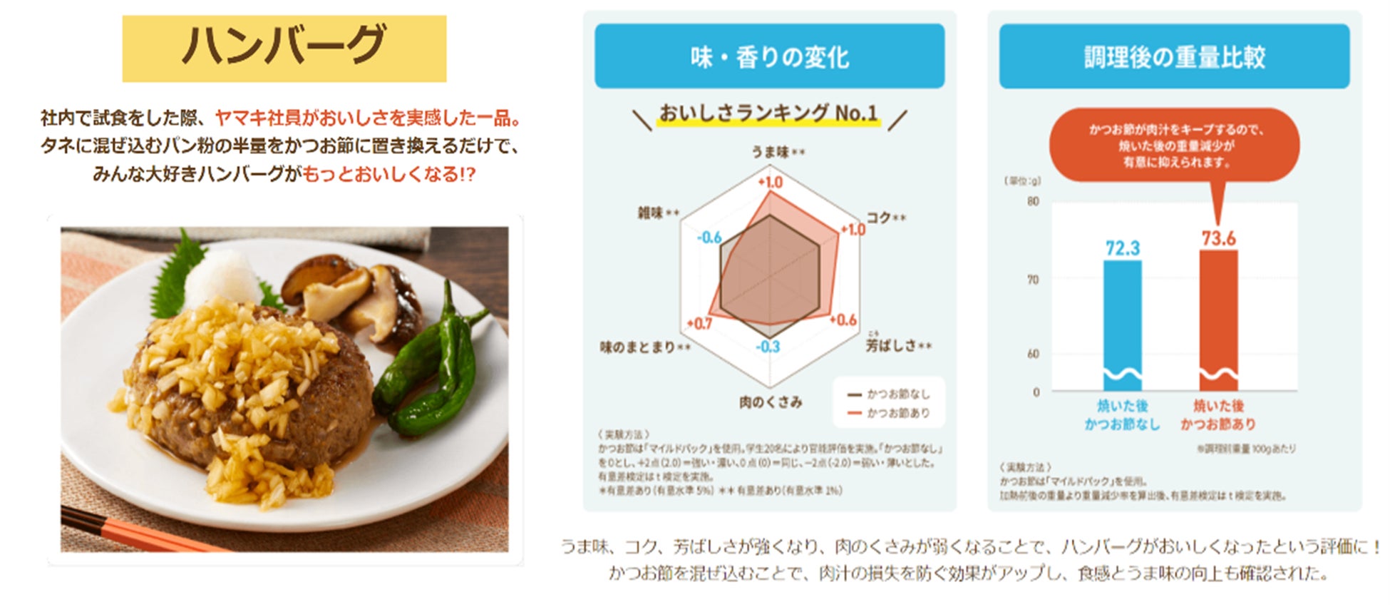 ヤマキ株式会社は、かつお節の価値や魅力を広める活動「ヤマキ かつお節プラス」の一環として、立命館大学 食マネジメント学部と連携し、ハンバーグやポテトサラダなどの定番料理からバニラアイスまで、様々な料理とかつお節の相性を味や香り、栄養バランスなどの観点から研究・解析いたしました。