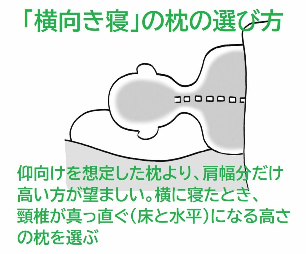 横向きで寝る場合は、仰向けを想定した枕の高さよりも、肩幅の分だけ高いほうがよいでしょう。横に寝たとき、頸椎が真っ直ぐ(床と水平)になる高さの枕を選ぶのが理想です。